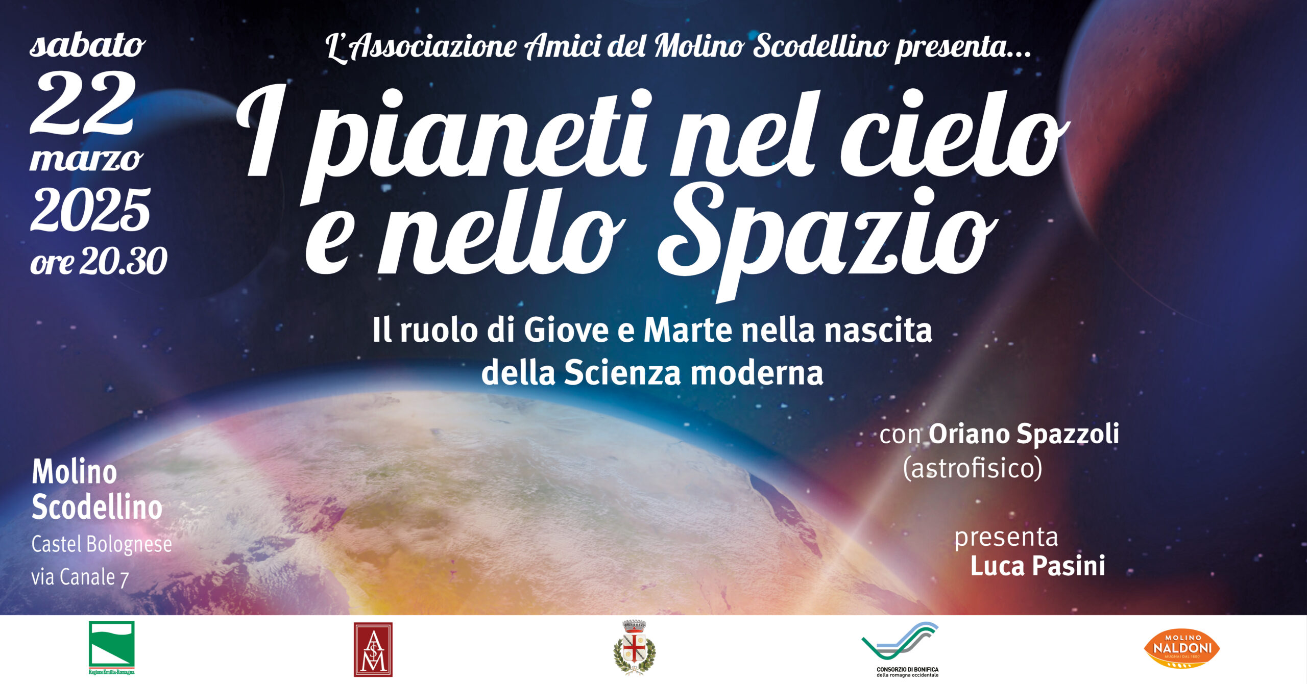 Sabato 22 marzo, alle ore 20:30, il Mulino Scodellino ospita l’astrofisico Oriano Spazzoli, che ci guiderà in un affascinante viaggio alla scoperta del ruolo di Giove e Marte nella nascita della scienza moderna.