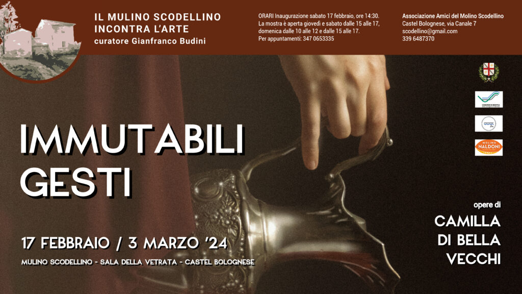 IMMUTABILI GESTI è il titolo della personale fotografica che l’artista Camilla Di Bella Vecchi esporrà nella Sala della Vetrata al Mulino Scodellino di Castel Bolognese (via Canale 7) a partire da sabato 17 febbraio (inaugurazione ore 14.30) e visitabile fino al 3 marzo prossimo.